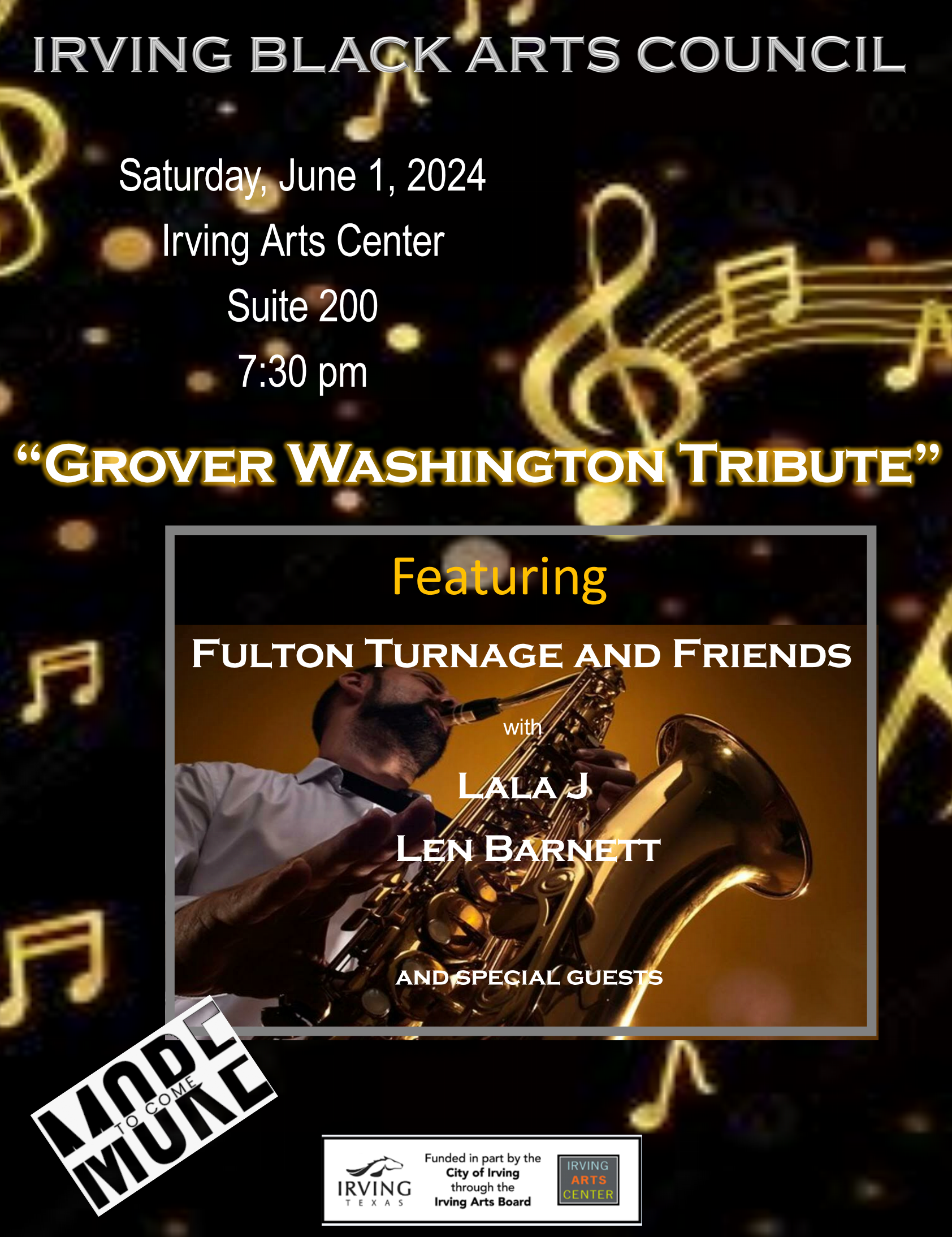 You are cordially invited to celebrate Black Music Month with Len Barnett, Percussionist, and other great jazz artists at the Irving Arts Center “Grover Washington Tribute” presented by the Irving Black Arts Council on June 1st, 2024 at 7:30 pm.